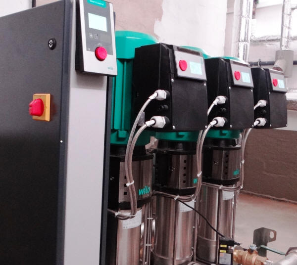 Druckerhöhungsanlage: März 2016, Der Druck des von den Stadtwerken gelieferten Frischwassers reicht nicht aus, um das Wasser in die oberen Stockwerke zu drücken. Der Druck wird deshalb mit den drei Pumpen der Anlage entsprechend angehoben. Kosten ca. 25 000 EURO