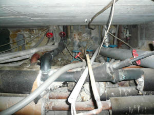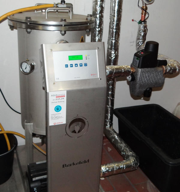 Enthärtungsanlage April 2016, Das Wasser in der Heizungsanlage wird aus dem Stadtwassernetz bezogen und bei Verlusten auch automatisch nachgespeist. Der im Stadtwasser enthaltene Kalk fällt bei Erwärmung aus, so dass auf Dauer die Rohre verkalken können. Deshalb wird das Stadtwasser über die Anlage zugeführt, in der über einen Harzfilter entkalkt wird. Kosten ca. 12 000 EURO